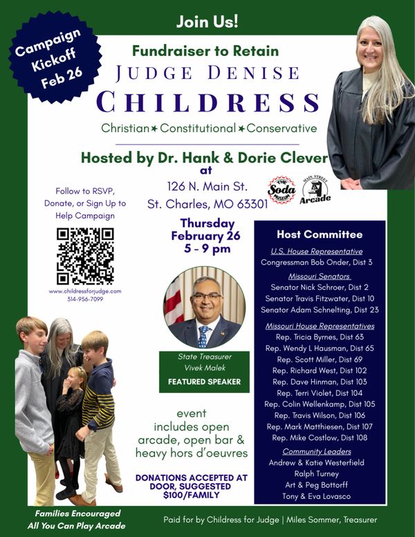 Join us Thursday, February 26, 2026, for Judge Childress's official Campaign Kickoff fundraiser! Hosted by Dr. Henry "Hank" & Dorie Clever and featuring guest speaker State Treasurer Vivek Malek, the event will take place from 5-9pm at The Soda Museum & Main Street Arcade. With an All You Can Play Arcade this event is FAMILY FRIENDLY!! There will also be an open bar & heavy hors d'oeurves served.